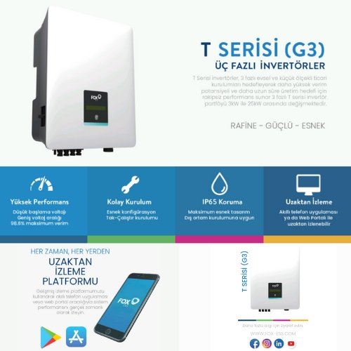 3 fazlı T serisi invertör portföyü 3 kW ile 25 kW arasında değişmektedir.
