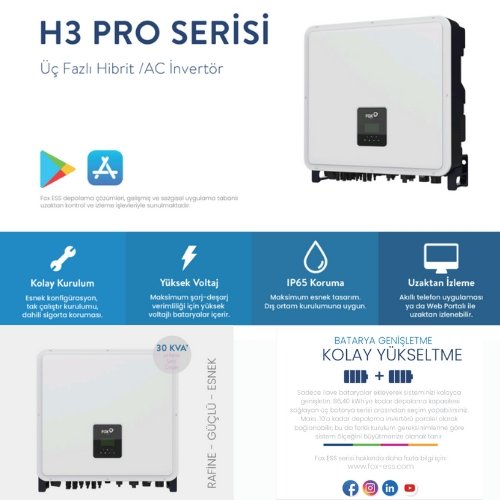 Fox ESS H3 PRO 30KW Üç Fazlı Hibrit İnvertör, profesyonel enerji yönetimi için yüksek performans, akıllı kontrol ve dayanıklılığı bir araya getirir.