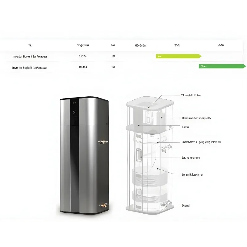 Evinizde sıcak su ihtiyacınızı karşılarken enerji tasarrufu yapmak ister misiniz? LG Therma V 270 LT Boyler Isı Pompası, modern teknolojisi ve yüksek verimliliği ile hem cebinizi hem de doğayı düşünen ideal bir çözümdür. Geleneksel su ısıtıcılara göre çok daha az enerji tüketerek sürekli sıcak su konforu sunar.