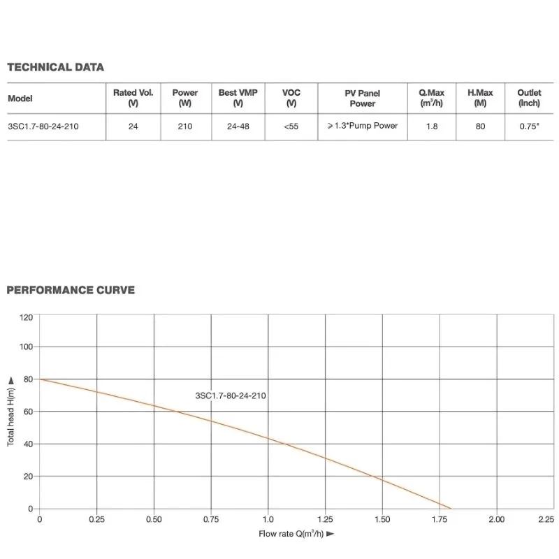 Kolay Kurulum: 24V çalışma voltajı (VMP 24-48V) ile uyumlu güneş panelleriyle doğrudan çalışır. VOC (açık devre voltajı) değeri 55V'nin altında olan panellerle güvenle kullanılabilir. PV panel gücünün pompanın gücünün 1.3 katından fazla olması önerilir, bu da pompanın en verimli şekilde çalışmasını sağlar.
